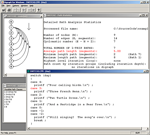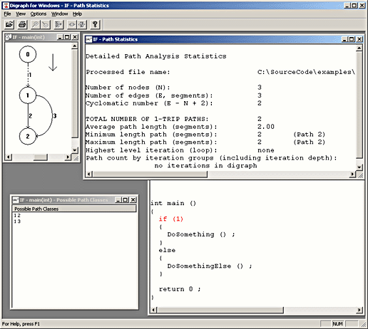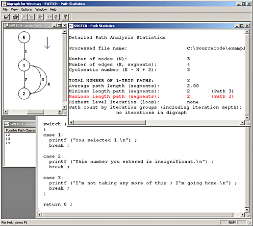 Detailed Path Analysis Statistics Processed file name: ElementTreePanel.dg Number of nodes (N): 7 Number of edges (E, segments): 11 Cyclomatic number (E - N + 2): 6 TOTAL NUMBER OF 1-TRIP PATHS: 9 Average path length (segments): 6.22 Minimum length path (segments): 2 (Path 1) Maximum length path (segments): 10 (Path 4) Highest level iteration (loop): 1 (Path 5) Path count by iteration groups (including iteration depth): BASIS PATHS (no iteration): 5 Level 1 loop(s): 4 Stopped at 1 iteration groups |