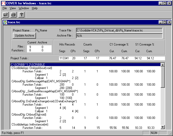 WINcover shows coverage values for C/C++ in a flexible graphical format. Current and past test information, complete details down to the segment or callpair level, and immediate source access are all available.